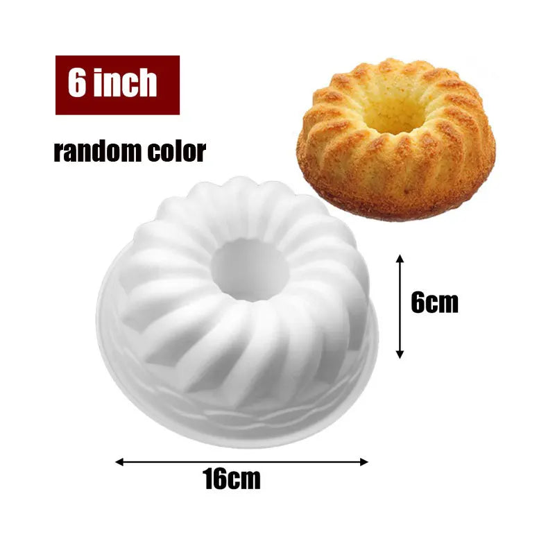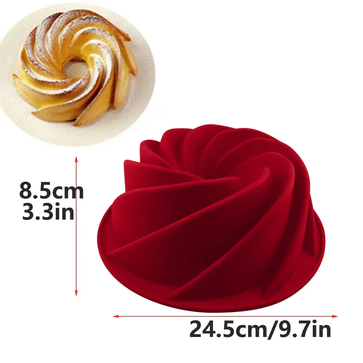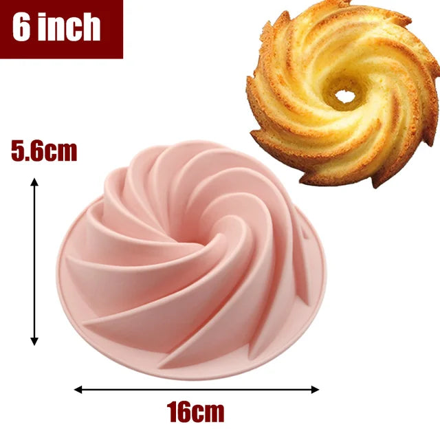 Non-stick silicone mold with a unique spiral pattern. Ideal for creating birthday cakes, brownies, and dessert decorations.