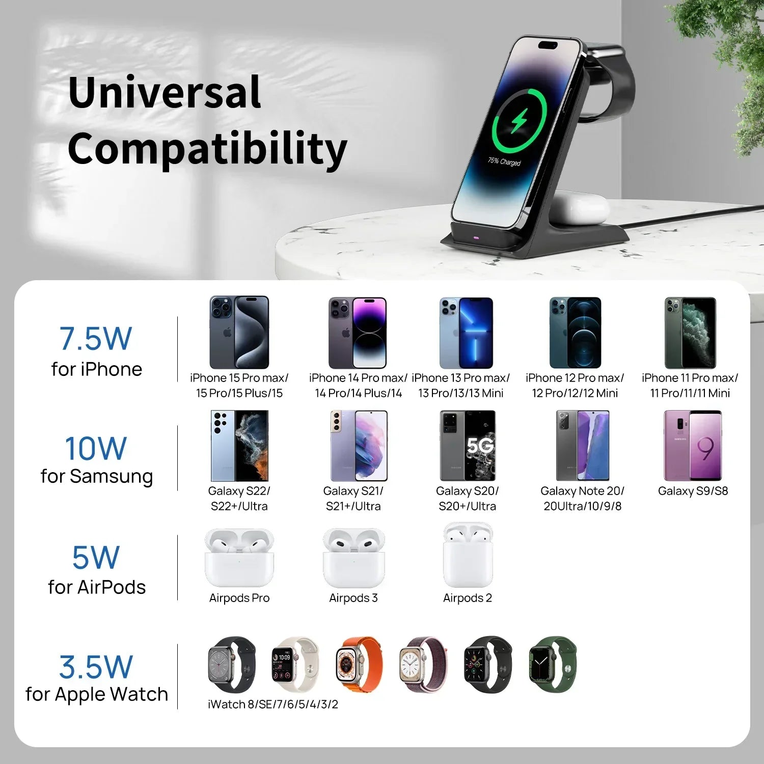Simplify charging with this 3-in-1 dock. Fast charges your iPhone, Apple Watch, and AirPods simultaneously in a sleek, organized design.